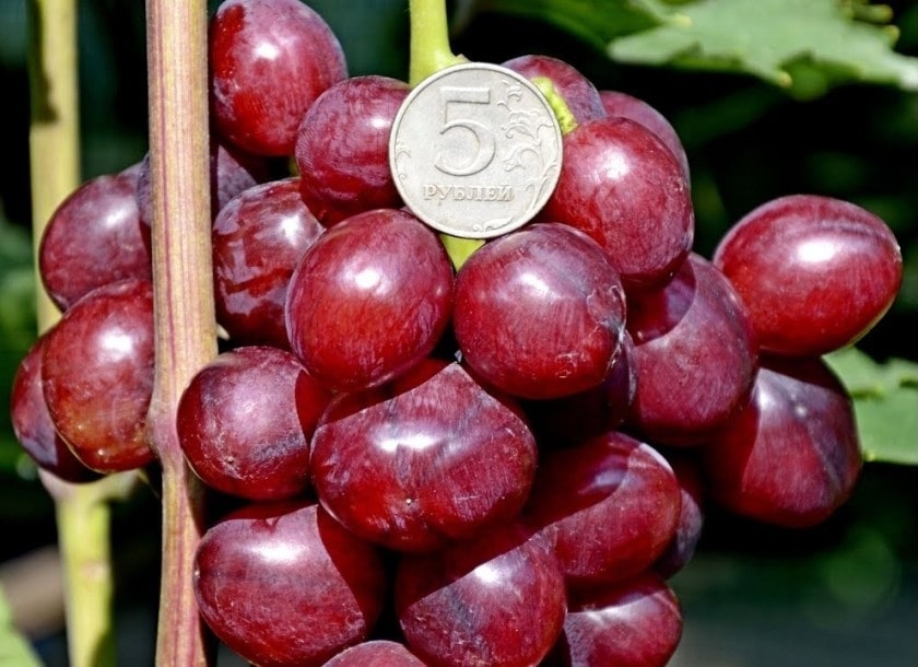 Виноград велюр отличается крупным размером ягод. Они имеют удлиненную форму без четко выраженного стремления к овалу, массу 14-16 г. На поверхности могут присутствовать бугорки, горбатости, другие неровности. Оттенок ягод варьируется от насыщенно-розового до глубокого красно-лилового по достижению максимальной спелости. Мякоть плотная, мясистая, внутри присутствует 3-4 косточки.
